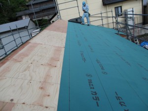 建物へ雨水の浸入を防ぐために屋根に防水シートを敷きます。