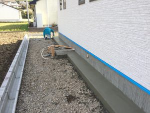 左官さんによるブロック積みや犬走りの仕上げ工事をしています。
