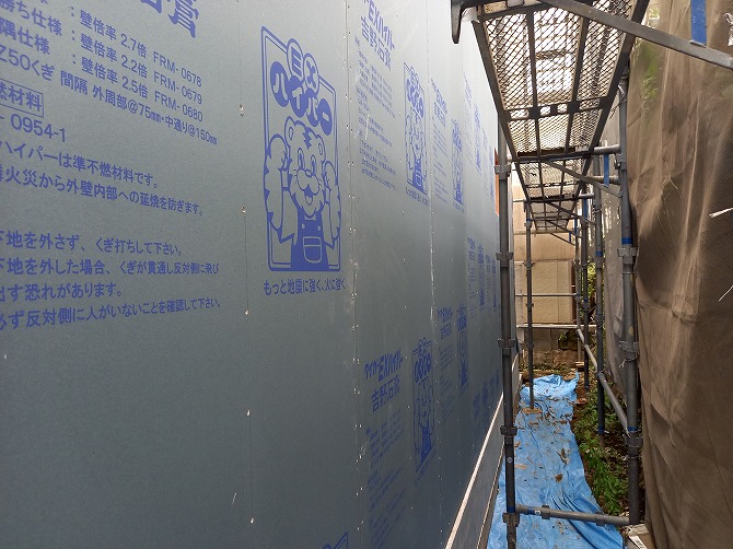 これは耐力面材といい、筋違いの代わりになり、建物の横揺れを面で支えるので、地震に強い建物になります。