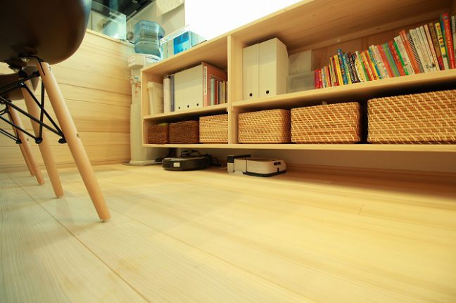 床と棚の間を浮かせ、ルンバが入るようにしています。