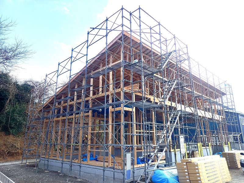 着工から完成まで 2026.03.07 現場だより 施工中 杭工事 地盤の補強のための杭工事を実施しました 約48坪の平屋の建物で、約100本の杭を施工しました 地面より、2m~4mの位置に、固い地盤がありましたので 鋼管の杭を、回転させながら、固い地盤に届くまで打ち込み、 建物を支えます