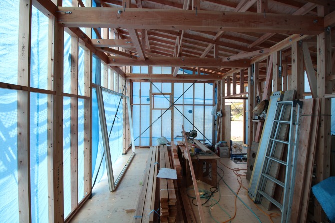 土台と大引が同じ高さで納まり、その上に24mmの構造用合板を敷くことで