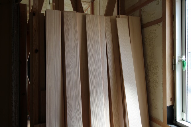 床はもちろん、壁や天井の一部に、もみの木を貼っていきます。